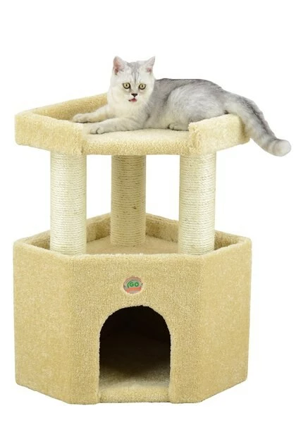 Give your queen the throne she deserves with the Go Pet Club 27-in Premium Carpeted Cat Tree Condo with Large House. This premium tree is designed in a wood frame and covered in a soft carpet to provide your feline friend with a comfortable surface to relax. The bottom enclosed condo offers a sense of safety and security when your cat wants a little privacy from the outside world while the top observation perch is purr-fect for being social! Three posts are wrapped in sisal rope so your pal can naturally scratch away without damaging your furniture or flooring.