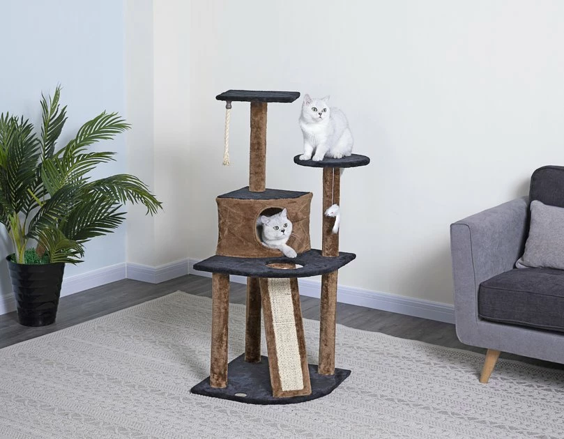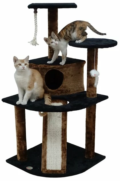 Give your kitty the paw-some gift of a healthy, active lifestyle with the Go Pet Club 47-inch Kitten Cat Tree Condo with Scratching Board. Designed for durability, this cool cat condo is constructed with compressed wood so your kitty can exercise on it for a long time to come. Itβs finished with a faux fur covering thatβs soft to her touch and provides plenty of comfy places to lounge. But first, sheβll have a great time exploring the individual perches and other nooks and crannies that this cat tree offers. Sheβll get out extra energy clawing the large, natural sisal scratching board and pouncing all around. If she needs a little extra peace and quiet, she can curl up in the condo playhouse for a nice little cat nap.