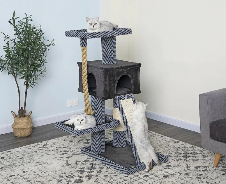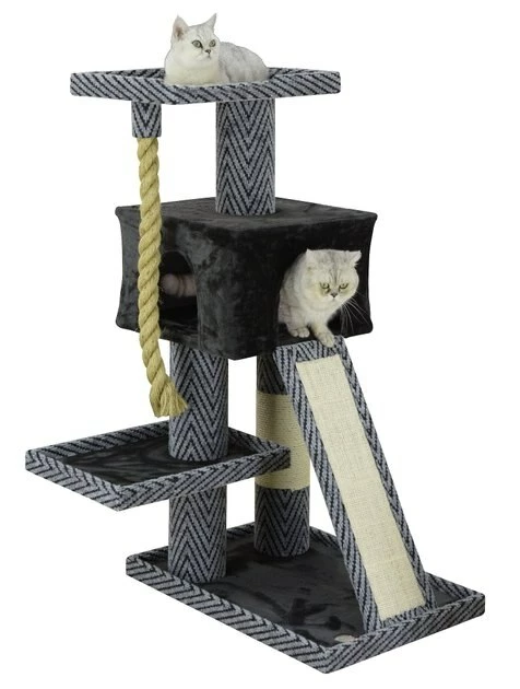 The Go Pet Club 49-in Sequoia Cat Tree Condo with Jungle Rope & Sisal Scratching Board will be enjoyed by your feline friend for years to come. At the center of this tree sits a faux-fur condo thatβs purr-fect for escaping the distractions of home, allowing your cat to sink into a cozy and comfy slumber. Elevated surfaces offer prime perching platforms so your girl can observe the room with a watchful eye. The scratching board ramp encourages your kitty to stretch out as she scratches, relieving excess energy and preventing her from clawing up your furniture. A thick dangly rope will surely catch her attention for interactive fun youβll love to watch!