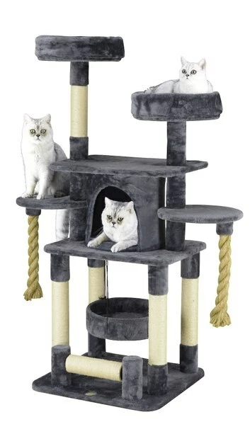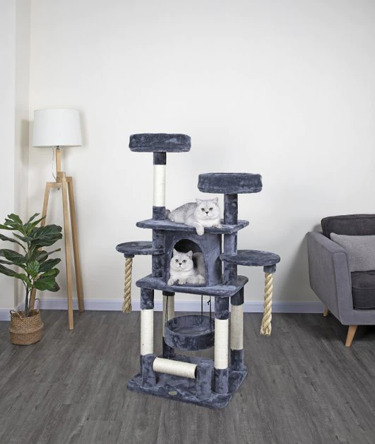 Get your cat the paw-sitive exercise and activity she needs to stay happy and healthy using the Go Pet Club 57.5-inch Jungle Rope Cat Tree with Sisal Covered Posts. She’ll love getting her work out by jumping from the raised-edge perch to open the platform and back again. Her routine will include climbing the hanging jungle ropes and scratching at the natural sisal covered posts. She’ll spin the bottom rotating post with her paws and go for a swing on the hanging bed. Then she’ll cuddle up in the quiet condo house for a cat nap or survey the scene from the comfort of the top two beds. She and her feline friends will have a great time performing unique acrobatics all across this beautiful and durable cat tree.