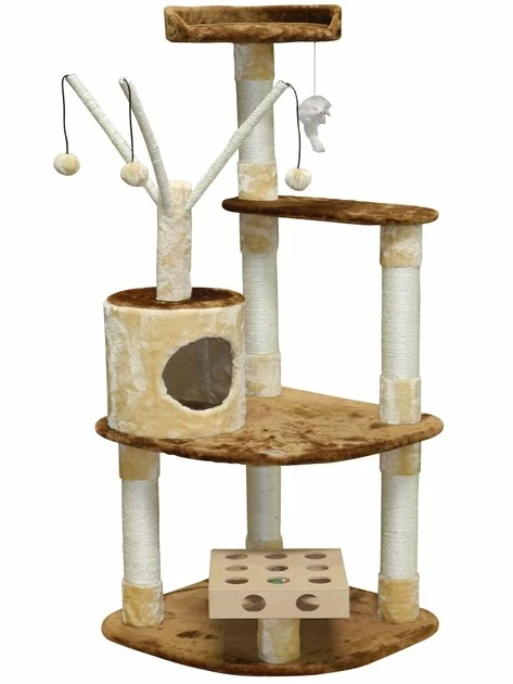 Whether your feline friend is young or old she will paw-sitively benefit from the Go Pet Club 60-in IQ Busy Box Cat Tree Condo & Dangling Toys. This faux-fur tree features an IQ Busy Box made up of cut-out holes and removable balls that encourage your cat to swat and bat away for interactive fun. Three hanging fur balls as well as a dangly toy mouse tap into your palβs natural hunting instincts while the sisal rope-wrapped posts satisfy her need to scratch. A cozy condo is the purr-fect retreat when wanting an escape from household distractions and the elevated surfaces and bed are just what your best bud needs to perch in comfort and security.