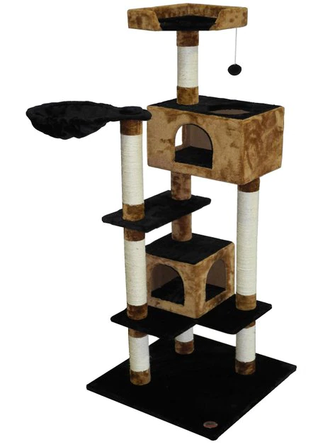 Your feline friend has many moods, so satisfy each one with the Go Pet Club 61-in Cat Tree House & Sisal Scratching Posts. This black and brown tree is outfitted in a soft faux-fur exterior and interior so your cat stays warm and comfy no matter what sheβs doing. The oasis includes not just one, but two cozy condos that can be used when your girl is feeling a bit more private. A larger condo sits up top for when your cat wants to spread out, while a smaller one is positioned below for compact cuddling. The elevated basket and top level bed are the best heights for perching and relaxing, giving your pal a great view of the room. Sisal rope-wrapped posts encourage natural scratching habits and the dangly toy ball engages her in physical and mental activity!
