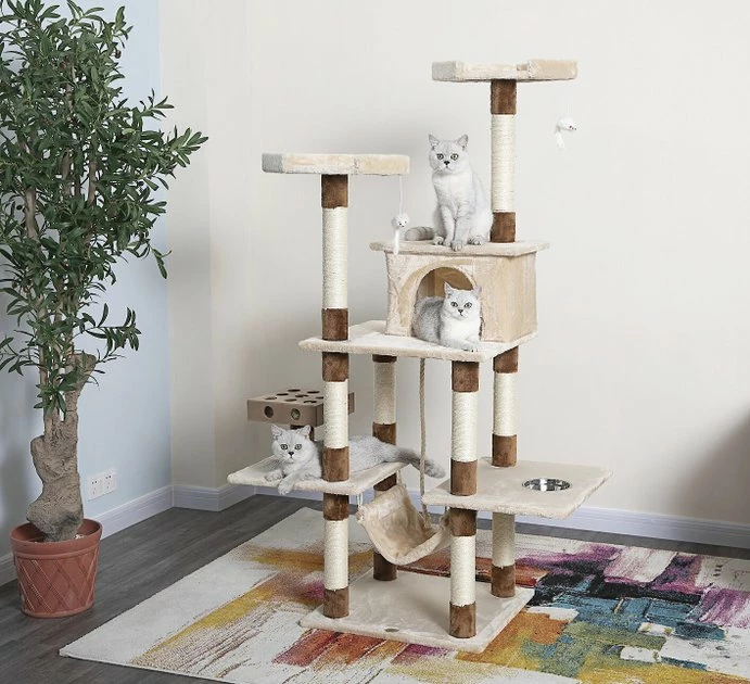 - Elevated platforms are made for perching while the sisal rope-wrapped posts are ideal for scratching.