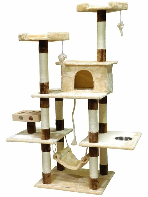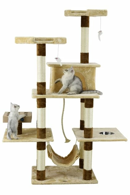 The Go Pet Club 70-in IQ Busy Box Cat Tree Condo with Feeding Bowl keeps your feline friendβs mind active and sharp even past her kitten days. This tree features a wooden-made IQ Busy Box, an engaging activity thatβs made with cut-out holes and removable balls for swatting and batting fun. Dangly toy mice and a hanging rope are purr-fect for tapping into your catβs natural hunting skills while the sisal rope-wrapped posts encourage positive scratching behavior. Your best bud wonβt even have to leave for meal time as this oasis includes a built-in feeding bowl for added convenience! Two elevated lofts are purr-fect for perching and the private condo offers a quiet escape from household distractions. When your pet is really in a chill mood, she can lounge in the low-level hammock for undisturbed relaxation!