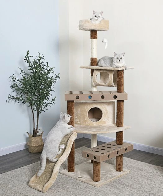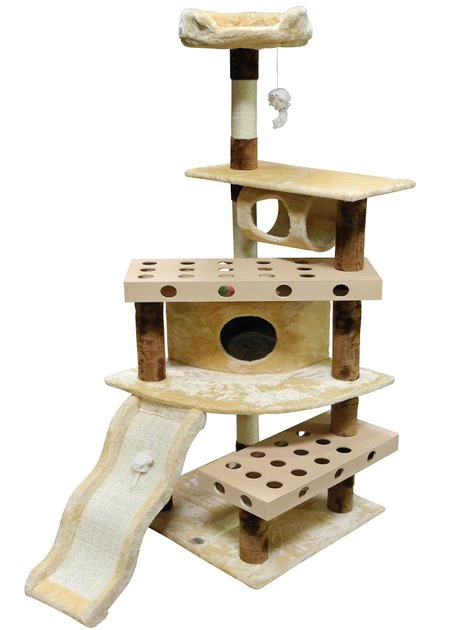 The Go Pet Club 70-in IQ Busy Box Cat Tree Condo & Sisal Scratching Board provides your pal with mental stimulation so he can always be on his game. This tree features not just one, but two IQ Busy Boxes, an engaging activity thatβs made with cut-out holes and removable balls for swatting and batting fun. Dangly toy mice are purr-fect for tapping into your catβs natural hunting skills while the sisal rope posts and ramp are designed for safe scratching. A lofted platform, tunnel and top-level bed give your feline friend the elevation he needs to perch and observe his kingdom. The cozy faux-fur design includes a private condo, a quiet escape for your cat for whenever he wants a getaway from household noise and distractions.