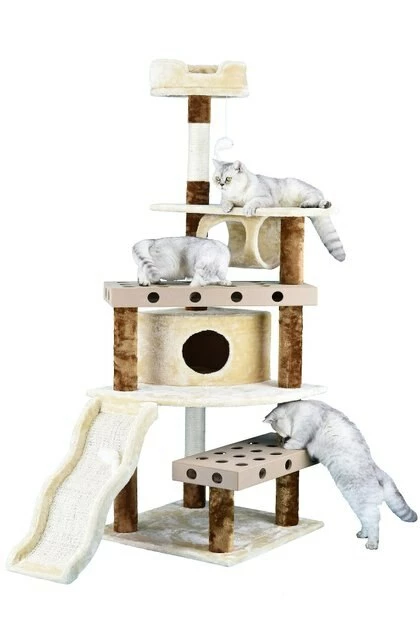 - A sisal rope slide and posts encourage natural scratching behavior to prevent your cat from clawing at your furniture.