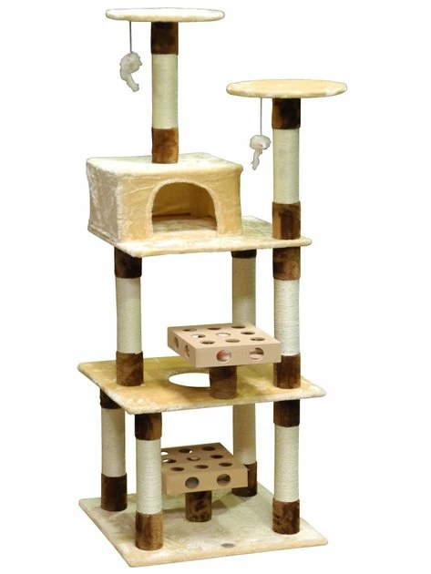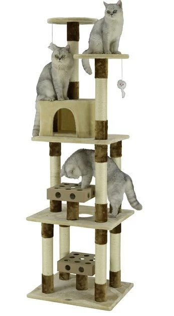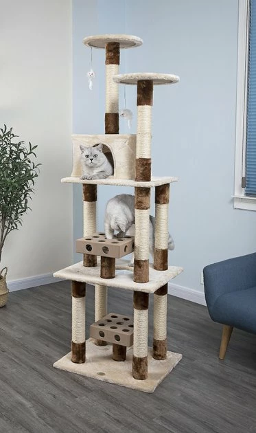 Never mind the couch or bed, your feline friendโs favorite spot in the house will paw-sitively be her Go Pet Club 74-in IQ Busy Box Cat Condo with 2 IQ boxes & Sisal Covered Scratching Posts. This interactive tree features two IQ Busy Boxes, an engaging activity made with cut-out holes and removable balls to encourage swatting and batting play. Two dangly mice hang above your cat to awaken her natural hunting instincts while the sisal rope-wrapped posts are made for scratching. When your pal wants a little privacy she can head to her very own condo retreat, a cozy escape thatโs purr-fect for lazy days. Elevated platforms will satisfy her love for perching so she can comfortably keep an eye on her kingdom!