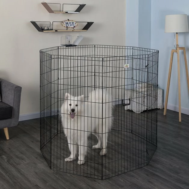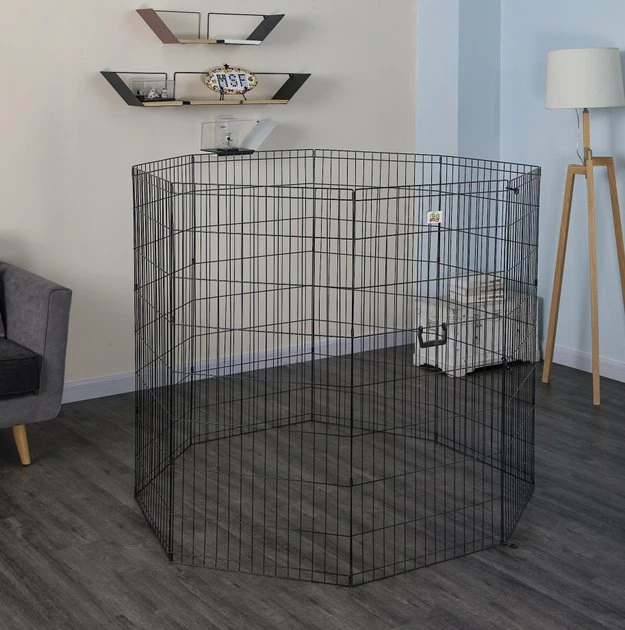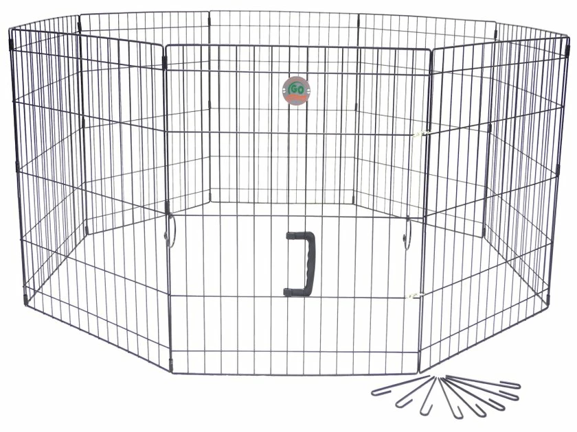 Give your pet his own paw-some place to play with the Go Pet Club Foldable Exercise Dog & Cat Pen. Youโll love knowing that heโs safe and secure and heโll love having an enclosed space where he can ruff-house without getting into trouble. Made from metal with a stylish black finish, this exercise pen is designed for durability both indoors and out. Setup is quick and easy for just about anyone and ground anchors are included to keep everything in place when outside. Heโll have a ball playing in his paw-fect, new 16 square foot pet exercise pen.