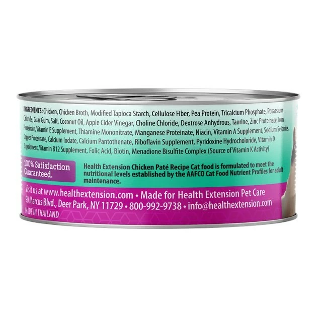 Even picky eaters just might be enticed by Health Extension Chicken Pate Grain-Free Wet Cat Food. This cat food is specially crafted to support your catβs health, including strong bones, a resilient immune system and a silky, shiny coat. Fortified with vitamins and minerals to help maintain a healthy urinary tract, this food is a purr-fectly nutritious and delicious meal for your feline friend. Itβs also formulated to be grain-free and made without artificial flavors, colors and preservatives. Your cat will love the flavor of chicken pateββand youβll love the holistic recipe.