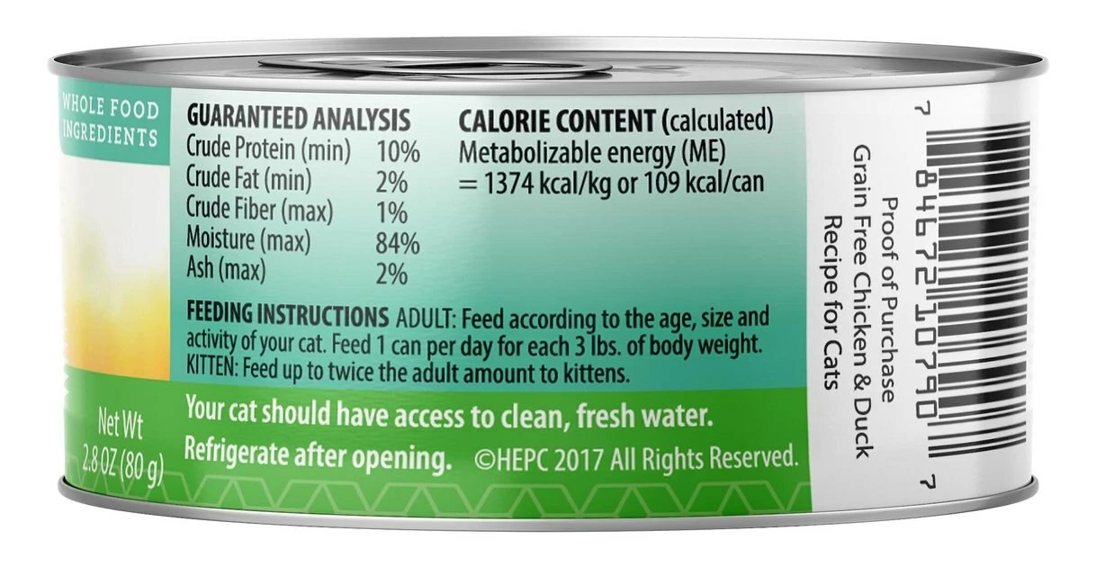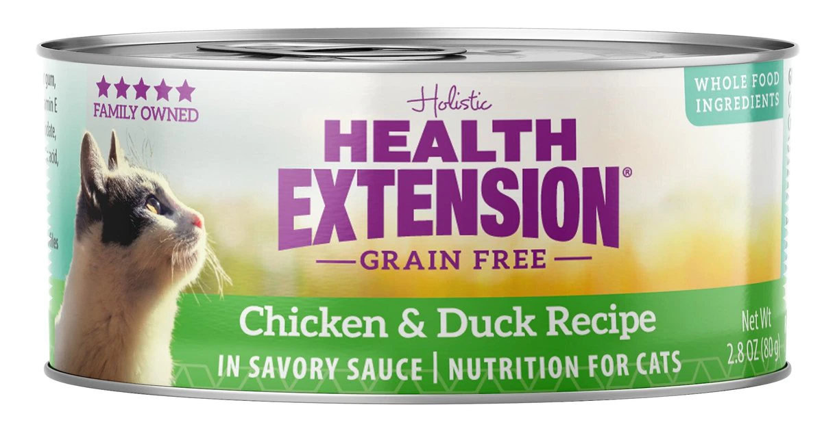 The Health Extension Grain-Free Chicken & Duck Recipe Canned Cat Food nourishes your feline with every single bite. Made to provide years of soft purrs and gentle nuzzles, this holistic recipe is specially formulated to promote a shiny coat, resilient immune system, flexible joints, and strong bones. Itโs chock full of vitamins and nutrients that also maintain a healthy urinary tract, and your cat will love the chicken and duck flavors with rich fruits and vegetablesโand youโll feel great about giving him paw-some food.