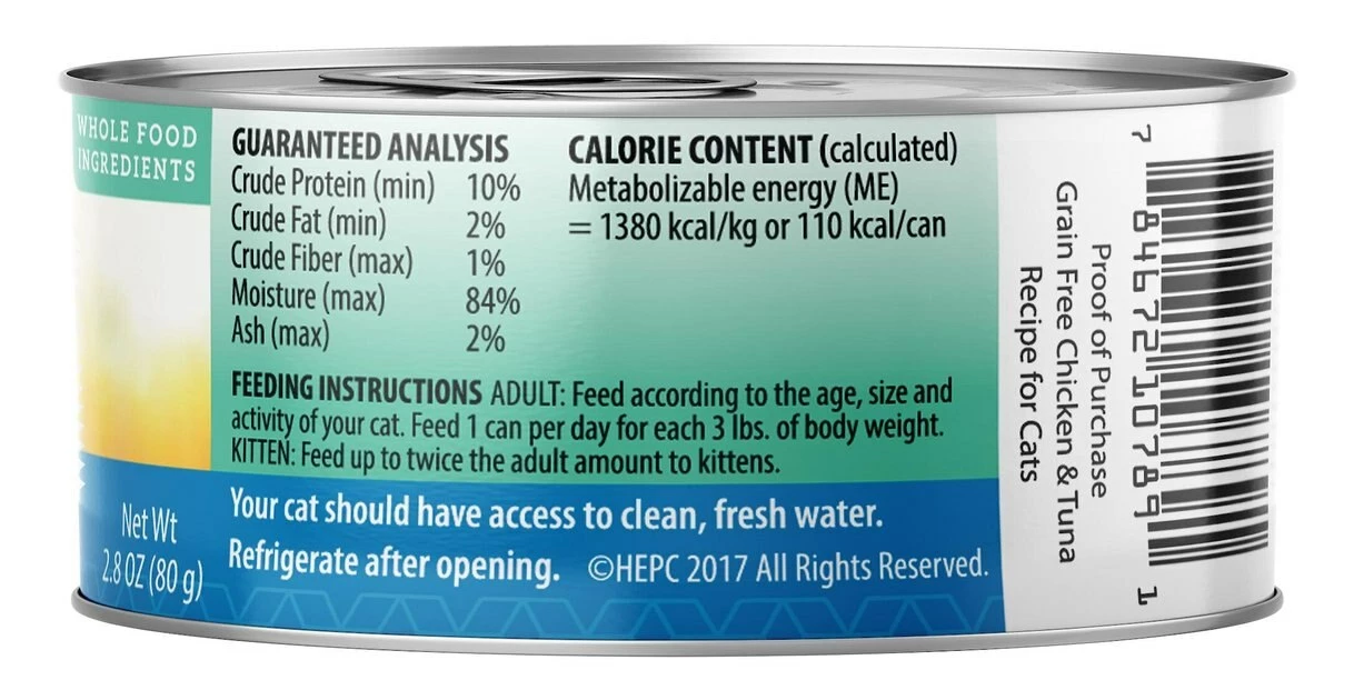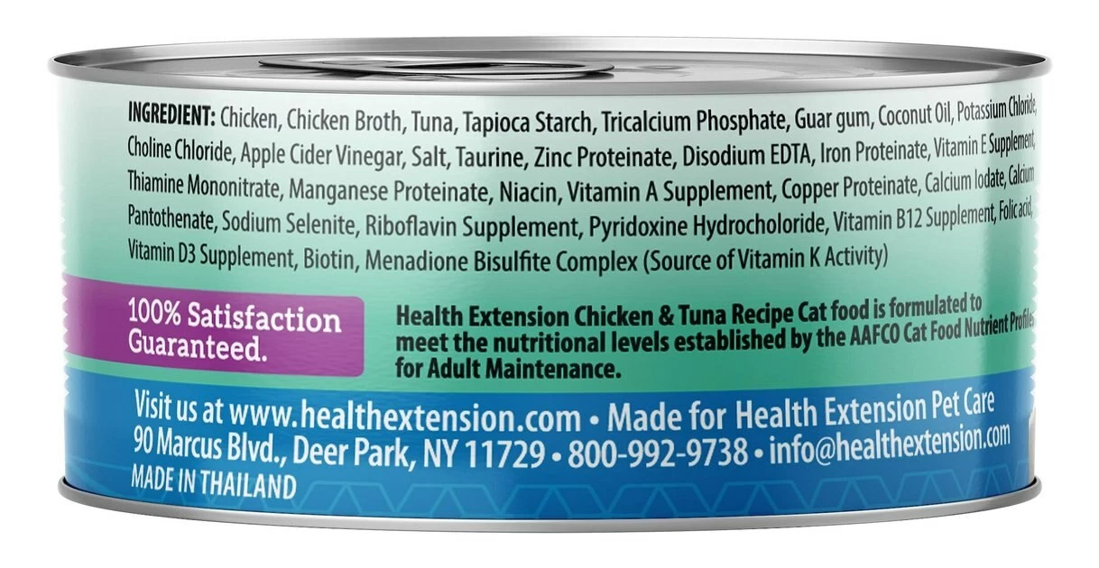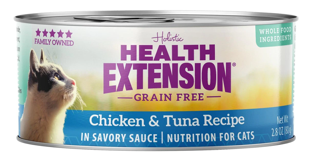 The Health Extension Grain-Free Chicken & Tuna Recipe Canned Cat Food nourishes your feline with every single bite. Made to provide years of soft purrs and gentle nuzzles, this holistic recipe is specially formulated to promote a shiny coat, resilient immune system, flexible joints, and strong bones. Itโs chock full of vitamins and nutrients that also maintain a healthy urinary tract, and your cat will love the chicken and tuna flavors with rich fruits and vegetablesโand youโll feel great about giving him paw-some food.