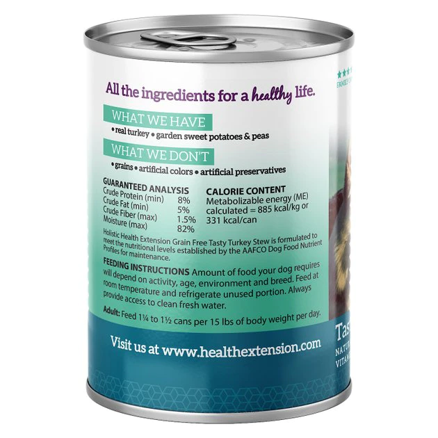 Health Extension provides a variety of premium, holistic choices for pet parents, including their delicious Grain-Free Tasty Turkey Stew Canned Dog Food. This savory stew is made with shreds of all-natural turkey raised without growth hormones or steroids for an excellent source of high-quality protein. There are no allergy-related fillers like grains, glutens or wheat to make sure your pup is getting the quality nutrition he needs. Health Extension Tasty Turkey Stew can be added to dry dog food for a hearty meal with added protein.