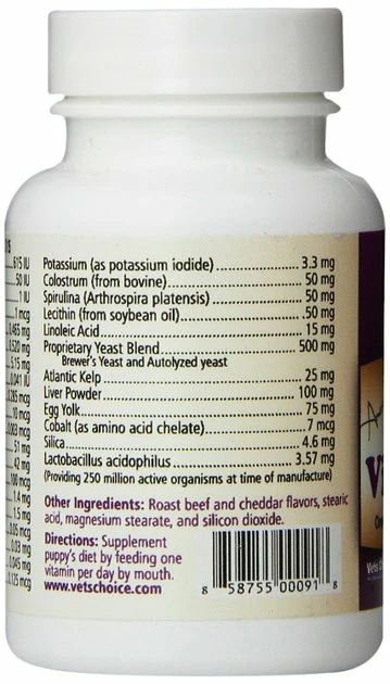 Vitamin A (As Beta Carotene) 615 IU Vitamin D (As Cholecalciferol) 50 IU Vitamin E1 IU Vitamin K (As Phytonadione) 1 Mcg Thiamin 0.465 Mg Riboflavin (Vitamin B-2) 0.520 Mg Niacin (Vitamin B-3) 5.15 Mg Vitamin B-60.041 Iu Folate (As Folic Acid) 0.285 Mcg Vitamin B-1210 Mcg Biotin 0.003 Mcg Calcium 51 Mg Phosphorus42 Mg Iodine (As Potassium Iodide) 100 Mcg Magnesium1.4 Mg Zinc (As Zinc Oxide) 1.5 Mg Selenium (Naturally Occurring) 0.05 Mcg Copper (As Cupric Sulfate) 0.03 Mg Manganese 0.045 Mg Chromium 0.125 Mcg Potassium (As Potassium Iodide) 3.3 Mg Colostrum (From Bovine) 50 Mg Spirulina (Arthrospira Platensis) 50 Mg Lecithin (From Soybean Oil) 50 Mg Linoleic Acid 15 Mg Proprietary Yeast Blend 500 Mg Brewer’s Yeast And Autolyzed Yeast Atlantic Kelp25 Mg Liver Powder 100 Mg Egg Yolk 75 Mg Cobalt (As Amino Acid Chelate) 7 Mcgsilica4.6 Mg Lactobacillus Acidophilus 3.57 Mg.