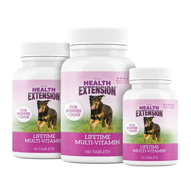 It is important to get all the nutrients your body needs through a healthy diet and by taking a multi-vitamin. Now with Health Extension Lifetime Vitamins, you can do the same for your best friend! These essential vitamins and minerals will help ensure good health as your puppy grows, and continuing health for your adult dog.