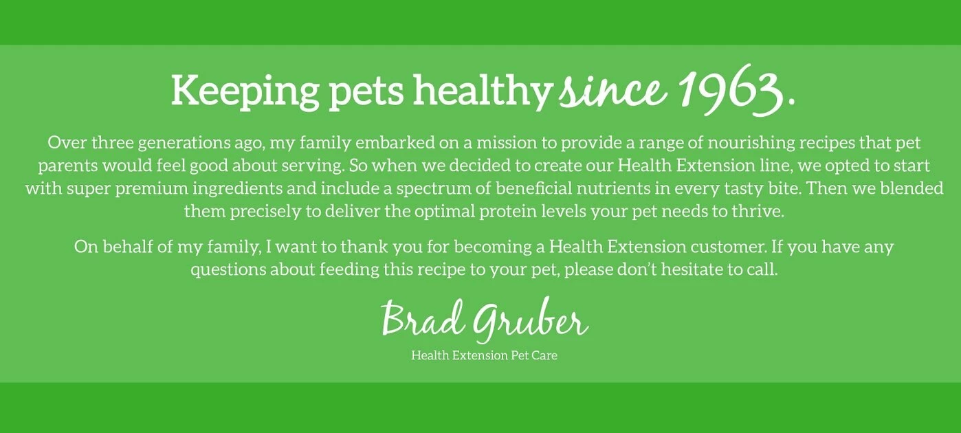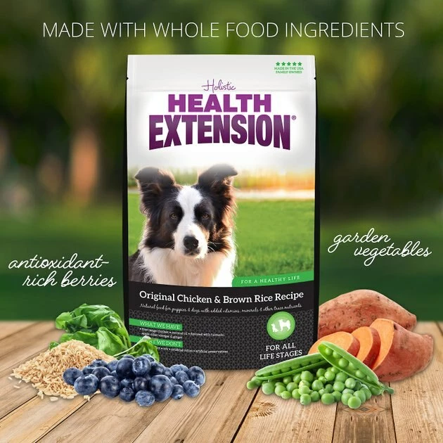 Make mealtime holistically nutritious with the Health Extension Original Dry Dog Food. Specially formulated for puppies and adult dogs, itโs made with organic, free-range chicken as the first ingredient, plus wholesome ingredients like brown rice, oatmeal, flaxseeds, and lamb. Designed to provide a balanced diet as well as promote overall health, it also has superfoods like astralagus, blue-green algae, ginger, gingko biloba, and primrose oil. Plus, it has glucosamine and chondroitin to help support strong and flexible joints, probiotics for tummy health, and kelp for a balanced blend of omega-3 and 6 fatty acids. The hypoallergenic, anti-hypoglycemic formula is made with no added sugar and never any gluten, corn, wheat, soy, by-products, artificial preservatives or colors.