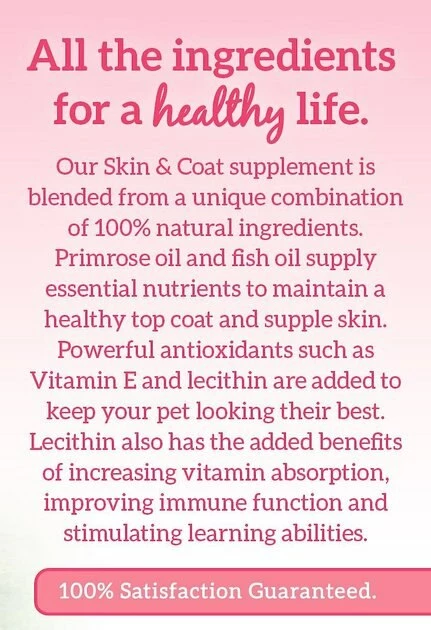 Skin & Coat can reduce shedding up to 70%! This formula supplies essential nutrients, maintains top coat condition, healthy skin and other bodily functions. This supplement also helps prevent scratching, flaky skin and a rough coat.