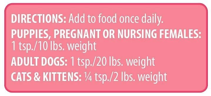 It is recommended to give the suggested dosage based off your petโs weight. Please refer to the Feeding Instructions tab and consult with your veterinarian for more information.