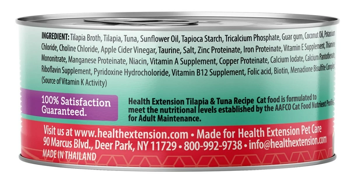 Tilapia & Tuna=Tilapia Broth, Tilapia, Tuna, Sunflower Oil, Tapioca Starch, Tricalcium Phosphate, Guar Gum, Coconut Oil, Apple Cider Vinegar, Choline Chloride, Potassium Chloride, Magnesium Sulfate, Taurine, Zinc Proteinate, Iron Proteinate, Vitamin E Supplement, Thiamine Mononitrate, Manganese Proteinate, Niacin, Vitamin A Supplement, Copper Proteinate, Calcium Iodate, Calcium Pantothenate, Sodium Selenite, Riboflavin Supplement, Pyridoxine Hydrochloride, Vitamin B12 Supplement, Folic Acid, Biotin, Menadione Sodium Bisulfite Complex (Source of Vitamin K Activity)