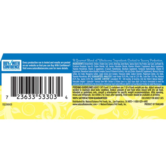 Treat your kitty to the gourmet nutrition he craves with the Natural Balance Delectable Delights Catatouille Stew Grain-Free Wet Cat Food. Made especially for kitties that love stews, it features shredded chicken and chicken broth as the first ingredients for all the protein your pal needs to thriveβnot to mention the irresistible flavor thatβll have him running to his bowl every time. Every juicy bite is loaded with wholesome veggies like green beans, spinach and carrots, plus vitamins, minerals and essential taurine to support nose-to-tail well-being. Itβs a complete and balanced meal for adult cats, on its own or as a tasty kibble topper. And itβs got absolutely no grains, corn, wheat or soy so kitties with food sensitivities can dive in, too!