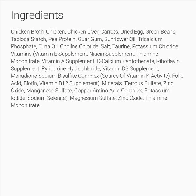 Chicken Broth, Chicken, Chicken Liver, Carrots, Dried Egg, Green Beans, Tapioca Starch, Pea Protein, Guar Gum, Sunflower Oil, Tricalcium Phosphate, Tuna Oil, Choline Chloride, Salt, Taurine, Potassium Chloride, Vitamins (Vitamin E Supplement, Niacin Supplement, Thiamine Mononitrate, Vitamin A Supplement, D-Calcium Pantothenate, Riboflavin Supplement, Pyridoxine Hydrochloride, Vitamin D3 Supplement, Menadione Sodium Bisulfite Complex (Source of Vitamin K Activity), Folic Acid, Biotin, Vitamin B12 Supplement), Minerals (Ferrous Sulfate, Zinc Oxide, Manganese Sulfate, Copper Amino Acid Complex, Potassium Iodide, Sodium Selenite), Magnesium Sulfate, Zinc Oxide, Thiamine Mononitrate.