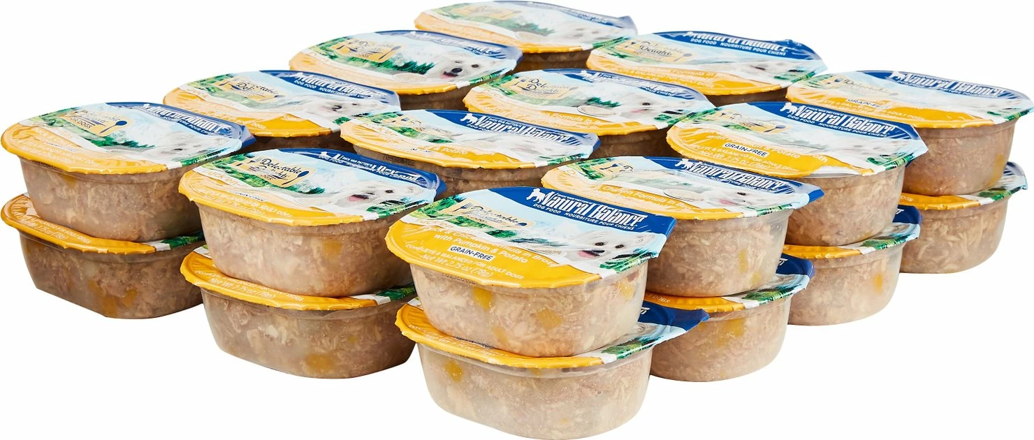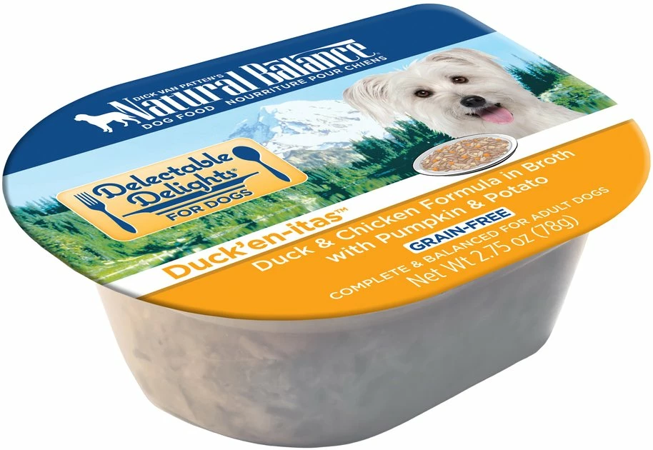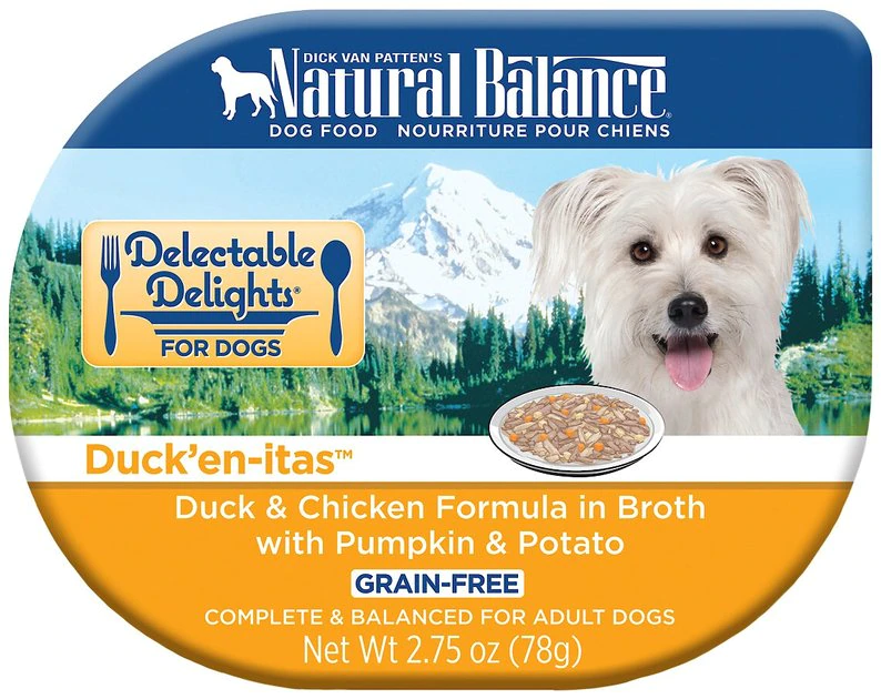 Natural Balance Delectable Delights Duck’en-itas Grain-Free Wet Dog Food lets your dog enjoy a highly palatable gourmet meal filled with delicious natural ingredients. This grain-free recipe is handcrafted with duck and chicken and cooked to perfection in a savory broth with wholesome pumpkin. Duck’en-itas gives your pup high-quality nutrition that can be served by itself or as a topper for a tasty dinner he wonโt be able to resist.