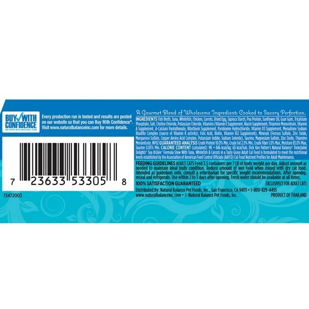 Treat your kitty to the gourmet nutrition he craves with the Natural Balance Delectable Delights Sea Brulee Stew Grain-Free Wet Cat Food. Made especially for kitties that love juicy stews, it features shredded tuna and tuna broth as the first ingredients for all the protein your pal needs to thriveβnot to mention the irresistible flavor thatβll have him running to his bowl every time. Every gravy-licious bite is loaded with wholesome veggies like peas and carrots, plus vitamins, minerals and essential taurine to support nose-to-tail well-being. Itβs a complete and balanced meal for adult cats, on its own or as a tasty kibble topper. And itβs got absolutely no grains, corn, wheat or soy so kitties with food sensitivities can dive in, too!