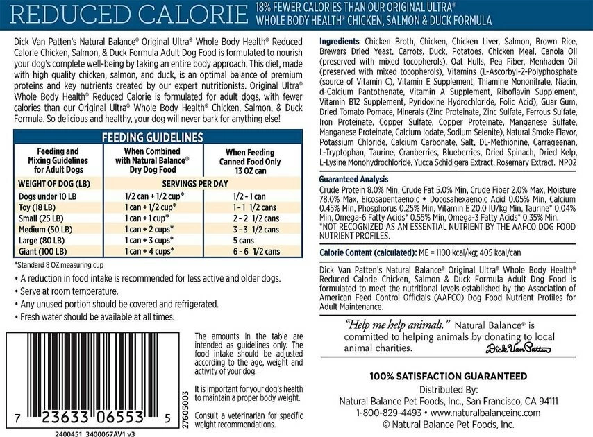 Looking for the perfect balance between dry and wet dog food? Look no further than Natural Balance Fat Dogs Chicken & Salmon Formula Low Calorie Dry Food + Original Ultra Whole Body Health Reduced Calorie Chicken, Salmon & Duck Formula Canned Dog Food! If your dogโs a little overweight and needs to lose a few pounds, Fat Dogs Low Calorie Dry Dog Food is made specifically for overweight adult dogs. Designed to keep your dog nutritionally balanced even though they are eating fewer calories, this diet offers a special protein and fiber blend to help your dog lose weight in a healthy and delicious way. Plus, it will help keep him full between meals and will help prevent begging. Natural Balance wet dog food is formulated to nourish your adult dogโs complete well-being by taking an entire body approach. This gluten-free diet, made with high quality chicken, salmon and duck, is an optimal balance of premium proteins and key nutrients created by expert nutritionists. With added vitamins like vitamin A and vitamin B12 to help support a healthy immune system and antioxidant nutrients and minerals for optimal brain health, this food is amazing for your dogโs weight loss journey. So delicious and healthy, your dog will never bark for anything else!