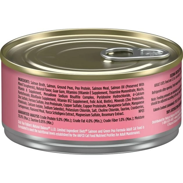Give your sensitive kitty the nutrition he craves with the Natural Balance L.I.D. Limited Ingredient Diets Salmon & Green Pea Formula Grain-Free Canned Cat Food. Made especially for kitties with sensitivities, this recipe contains just a few carefully-chosen ingredients that will keep him thriving, including a single animal protein sourceโsavory salmonโas the top ingredient to support all those furry adventures. Every juicy bite is loaded with vitamins, minerals, essential taurine, and omegas to support nose-to-tail well-being and a lustrous coatโnot to mention the irresistible flavor thatโll have him running to his bowl every time. And since itโs made with real broth, it helps keep your kitty hydrated to support urinary health. Plus, it has zero grains or anything artificial. Because sensitive or not, heโs a carnivore at heart.