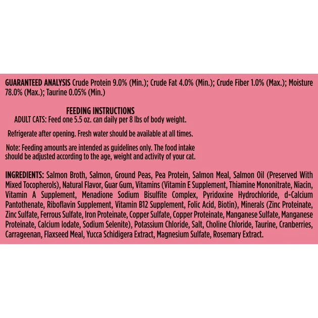 Salmon Broth, Salmon, Ground Peas, Pea Protein, Salmon Meal, Salmon Oil (Preserved with Mixed Tocopherols), Natural Flavor, Guar Gum, Vitamins (Vitamin E Supplement, Thiamine Mononitrate, Niacin, Vitamin A Supplement, Menadione Sodium Bisulfite Complex, Pyridoxine Hydrochloride, D-Calcium Pantothenate, Riboflavin Supplement, Vitamin B12 Supplement, Folic Acid, Biotin), Minerals (Zinc Proteinate, Zinc Sulfate, Ferrous Sulfate, Iron Proteinate, Copper Sulfate, Copper Proteinate, Manganese Sulfate, Manganese Proteinate, Calcium Iodate, Sodium Selenite), Potassium Chloride, Salt, Choline Chloride, Taurine, Cranberries, Carrageenan, Flaxseed Meal, Yucca Schidigera Extract, Magnesium Sulfate, Rosemary Extract.
