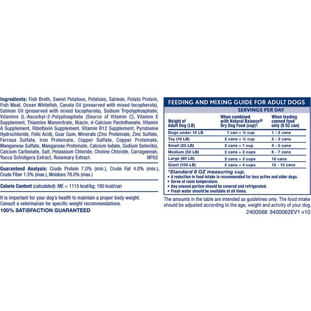 Fish and chips for your favorite furry friend! Natural Balance L.I.D. Limited Ingredient Diets Fish & Sweet Potato Canned Dog Food is made with lean fish and only one carbohydrate source, making it perfect for pups with sensitive stomachs or dry, itchy skin from food-related allergies. The potassium-rich formula is made without grains and contains no artificial colors or preservatives. Serve it on its own or combine with Fish & Sweet Potato Dry Dog Food to add additional hydration to your pup’s diet.