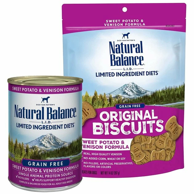 - This duo includes Natural Balance L.I.D. Limited Ingredient Diets Sweet Potato & Venison Formula Grain-Free Canned Dog Food and Natural Balance L.I.T. Limited Ingredient Grain-Free Treats Sweet Potato & Venison Formula Dog Treats.