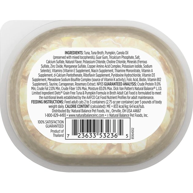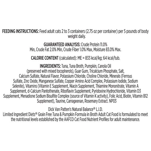 Give your sensitive kitty the nutrition he craves with the Natural Balance L.I.D. Limited Ingredient Diets Tuna & Pumpkin Formula Flaked Grain-Free Wet Cat Food. Made especially for kitties with sensitivities, this recipe contains just a few carefully-chosen ingredients that will keep him thriving, including a single animal protein source—flaked tuna—as the top ingredient to support all those furry adventures. Every juicy bite is loaded with fiber-rich pumpkin, vitamins, minerals, essential taurine, and omegas to support nose-to-tail well-being and a lustrous coat—not to mention the irresistible flavor that’ll have him running to his bowl every time. And since it’s made with real broth, it helps keep your kitty hydrated to support urinary health. Plus, it has zero grains or anything artificial. Because sensitive or not, he’s a carnivore at heart.