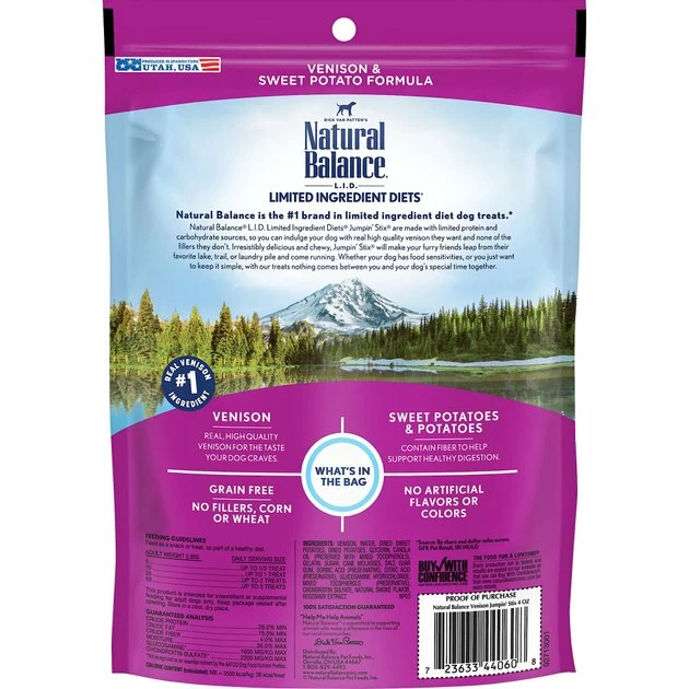 Help support healthy hips and joints! Your dog with jump for joy for the delicious taste that helps him stay active and happy! Natural Balance Limited Ingredient Diets Jumpinโ Stix Venison & Sweet Potato Formula Dog Treats are made with high quality proteins and are formulated with glucosamine and chondroitin so they help support healthy hips and joints. Whether hidden in a toy or just for sharing a quick moment, these treats are the perfect way to share a smile.