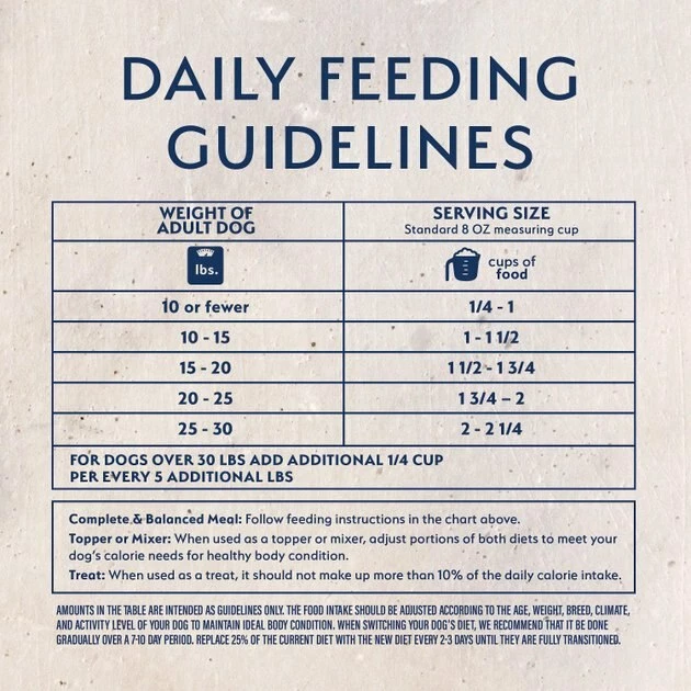 Topper or Mixer: When used as a topper or mixer, adjust portions of both diets to meet your dog’s calorie needs for healthy body condition.