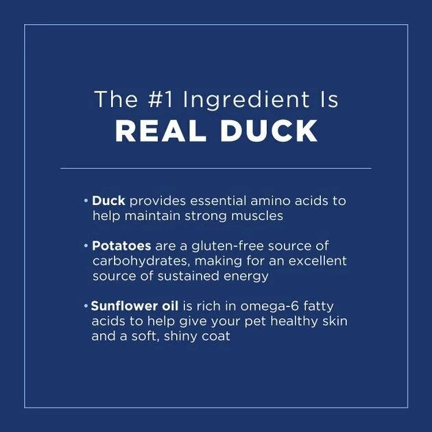 Duck, Duck Meal, Potatoes, Sweet Potatoes, Tapioca Starch, Brewers Dried Yeast, Canola Oil (Preserved With Mixed Tocopherols), Potato Protein, Flaxseed, Natural Flavor, Salt, Potassium Chloride, Menhaden Fish Oil (Preserved With Mixed Tocopherols), Taurine, Dl-Methionine, Choline Chloride, Vitamins (Vitamin E Supplement, Ascorbic Acid, Niacin Supplement, Vitamin A Supplement, Thiamine Mononitrate, D-Calcium Pantothenate, Riboflavin Supplement, Pyridoxine Hydrochloride, Vitamin B12 Supplement, Folic Acid, Vitamin D3 Supplement, Biotin), Minerals (Zinc Proteinate, Zinc Sulfate, Ferrous Sulfate, Iron Proteinate, Copper Sulfate, Copper Proteinate, Sodium Selenite, Manganese Sulfate, Manganese Proteinate, Calcium Iodate), Citric Acid (Preservative), Mixed Tocopherols (Preservative), Rosemary Extract.