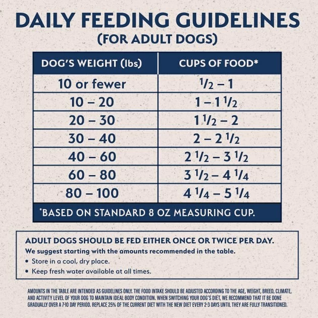 Adult dogs should be fed either once or twice per day. When you first start feeding Natural Balanceยฎ L.I.D. Limited Ingredient Diet Dry Dog Food, we suggest starting with the amounts recommended in the table. Energy requirements vary with environmental conditions, temperature and activity of your dog. The amount of food should always be adjusted to suit your dog’s needs.