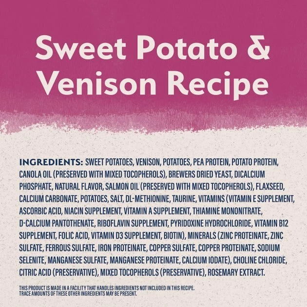 Sweet Potatoes, Venison, Potatoes, Pea Protein, Potato Protein, Canola Oil (Preserved With Mixed Tocopherols), Brewers Dried Yeast, Dicalcium Phosphate, Natural Flavor, Salmon Oil (Preserved With Mixed Tocopherols), Flaxseed, Calcium Carbonate, Potatoes, Salt, Dl-Methionine, Taurine, Vitamins (Vitamin E Supplement, Ascorbic Acid, Niacin Supplement, Vitamin A Supplement, Thiamine Mononitrate, D-Calcium Pantothenate, Riboflavin Supplement, Pyridoxine Hydrochloride, Vitamin B12 Supplement, Folic Acid, Vitamin D3 Supplement, Biotin), Minerals (Zinc Proteinate, Zinc Sulfate, Ferrous Sulfate, Iron Proteinate, Copper Sulfate, Copper Proteinate, Sodium Selenite, Manganese Sulfate, Manganese Proteinate, Calcium Iodate), Choline Chloride, Citric Acid (Preservative), Mixed Tocopherols (Preservative), Rosemary Extract.