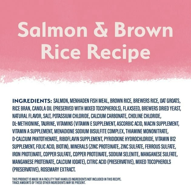 Salmon, Menhaden Fish Meal, Brown Rice, Brewers Rice, Oat Groats, Rice Bran, Canola Oil (Preserved With Mixed Tocopherols), Flaxseed, Brewers Dried Yeast, Natural Flavor, Salt, Potassium Chloride, Calcium Carbonate, Choline Chloride, Dl-Methionine, Taurine, Vitamins (Vitamin E Supplement, Ascorbic Acid, Niacin Supplement, Vitamin A Supplement, Menadione Sodium Bisulfite Complex, Thiamine Mononitrate, D-Calcium Pantothenate, Riboflavin Supplement, Pyridoxine Hydrochloride, Vitamin B12 Supplement, Folic Acid, Biotin), Minerals (Zinc Proteinate, Zinc Sulfate, Ferrous Sulfate, Iron Proteinate, Copper Sulfate, Copper Proteinate, Sodium Selenite, Manganese Sulfate, Manganese Proteinate, Calcium Iodate), Citric Acid (Preservative), Mixed Tocopherols (Preservative), Rosemary Extract.