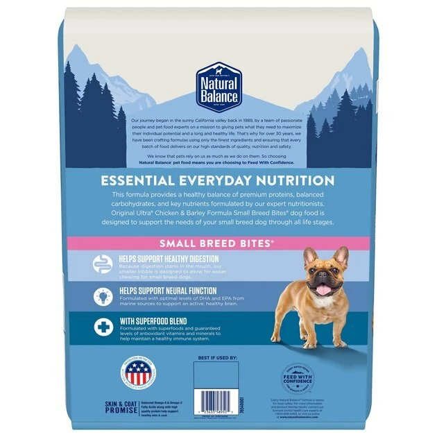 Nothingโs better than a tasty wholesome meal, and with Natural Balance Original Ultra Chicken & Barley Formula Small Breed Bites Dry Dog Food, youโll know your best fur-iend is getting just that. Crafted with real, tasty chicken and rich barley, this meal is formulated with a nutritious superfood blend to provide your small pup with the vitamins and minerals he needs to lead an active, healthy lifestyle. Plus, essential amino acids and fiber support strong muscles and healthy digestion. This dry food is crafted into smaller bitesโโpaw-fect for small breeds.