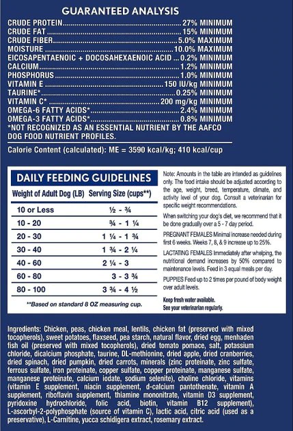 Chicken, Peas, Chicken Meal, Lentils, Chicken Fat (Preserved with Mixed Tocopherols), Sweet Potatoes, Flaxseed, Pea Starch, Natural Flavor, Dried Egg, Menhaden Fish Oil (Preserved with Mixed Tocopherols), Dried Tomato Pomace, Salt, Potassium Chloride, Dicalcium Phosphate, Taurine, Dl-methionine, Dried Apple, Dried Cranberries, Dried Spinach, Dried Pumpkin, Dried Carrots, Minerals (Zinc Proteinate, Zinc Sulfate, Ferrous Sulfate, Iron Proteinate, Copper Sulfate, Copper Proteinate, Manganese Sulfate, Manganese Proteinate, Calcium Iodate, Sodium Selenite), Choline Chloride, Vitamins (Vitamin E Supplement, Niacin Supplement, D-calcium Pantothenate, Vitamin A Supplement, Riboflavin Supplement, Thiamine Mononitrate, Vitamin D3 Supplement, Pyridoxine Hydrochloride, Folic Acid, Biotin, Vitamin B12 Supplement), L-ascorbyl-2-polyphosphate (Source of Vitamin C), Lactic Acid, Citric Acid (Used As A Preservative), L-carnitine, Yucca Schidigera Extract, Rosemary Extract.