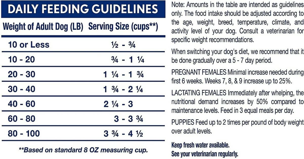 Amounts in the table are intended as guidelines only. The food intake should be adjusted according to the age, weight, breed, temperature, climate, and activity level of your dog. Consult a veterinarian for specific weight recommendations.