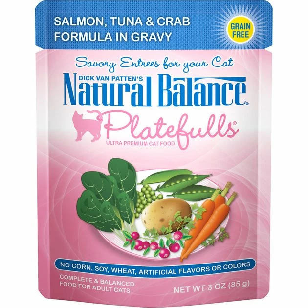 Treat your kitty to a plateful of goodness in every bowl with the Natural Balance Platefulls Salmon, Tuna & Crab Formula in Gravy Grain-Free Cat Food Pouches. Made especially for kitties with gourmet tastes, it features salmon, tuna, and crab as the top ingredients for all the protein your pal needs to thriveโnot to mention the irresistible flavor thatโll have him running to his bowl every time. Itโs made with wholesome veggies for a boost of antioxidants in every juicy bite, and real broth so it supports urinary health and keeps your kitty hydrated. Since itโs fortified with vitamins, minerals and essential taurine, it makes a complete and balanced diet for adult cats. Plus, it has zero grains or anything artificial. Because foodie or not, heโs a carnivore at heart.