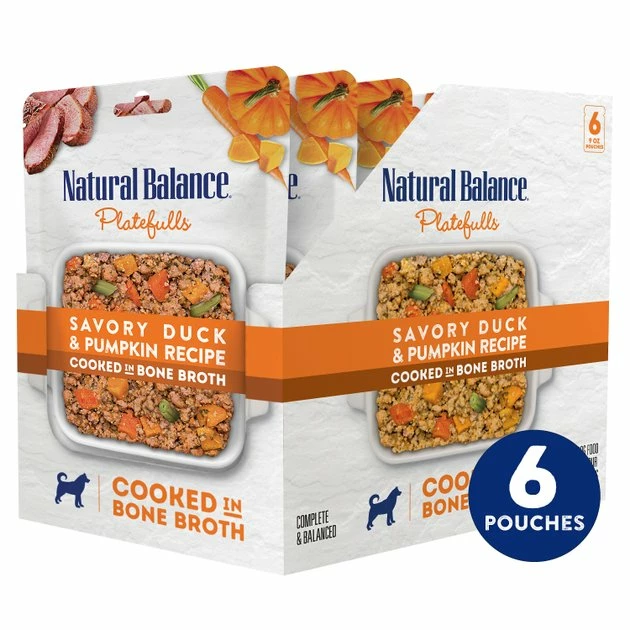 Your canine companion will be licking his chops once he takes a bite of Natural Balance Platefulls Savory Duck & Pumpkin Recipe Wet Dog Food! This complete and balanced homemade style meal is cooked in broth with real duck, carrots, pumpkin and green beans. Each portion comes in a ready-to-serve pouch that can be fed to your furry friend as either a meal or a tasty topper.