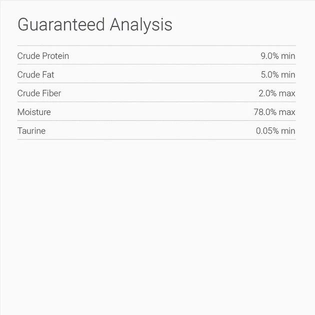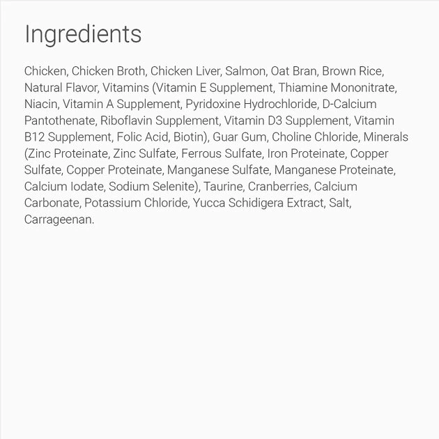 Chicken, Chicken Broth, Chicken Liver, Salmon, Oat Bran, Brown Rice, Natural Flavor, Vitamins (Vitamin E Supplement, Thiamine Mononitrate, Niacin, Vitamin A Supplement, Pyridoxine Hydrochloride, D-Calcium Pantothenate, Riboflavin Supplement, Vitamin D3 Supplement, Vitamin B12 Supplement, Folic Acid, Biotin), Guar Gum, Choline Chloride, Minerals (Zinc Proteinate, Zinc Sulfate, Ferrous Sulfate, Iron Proteinate, Copper Sulfate, Copper Proteinate, Manganese Sulfate, Manganese Proteinate, Calcium Iodate, Sodium Selenite), Taurine, Cranberries, Calcium Carbonate, Potassium Chloride, Yucca Schidigera Extract, Salt, Carrageenan.