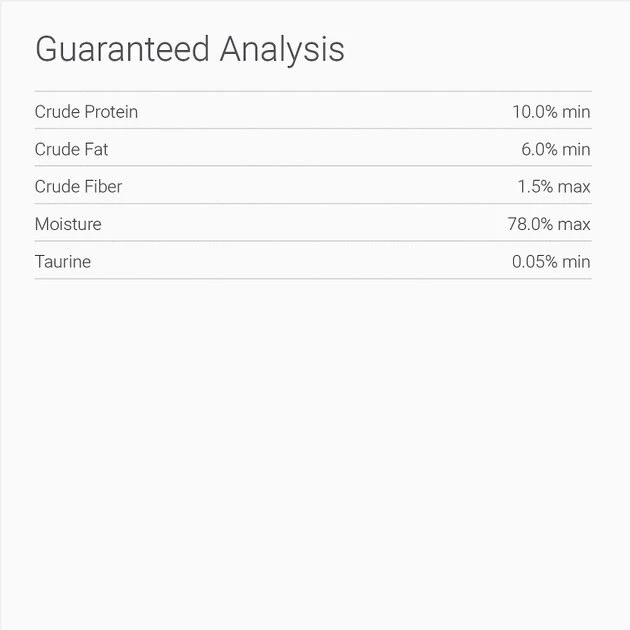 Salmon, Chicken, Chicken Liver, Fish Broth, Whitefish, Dried Egg, Ground Brown Rice, Carrots, Natural Flavor, Choline Chloride, Vitamins (Vitamin E Supplement, Thiamine Mononitrate, Niacin, Vitamin A Supplement, Menadione Sodium Bisulfite Complex, Pyridoxine Hydrochloride, D-Calcium Pantothenate, Riboflavin Supplement, Vitamin B12 Supplement, Folic Acid, Biotin), Cranberries, Guar Gum, Minerals (Zinc Proteinate, Zinc Sulfate, Ferrous Sulfate, Iron Proteinate, Copper Sulfate, Copper Proteinate, Manganese Sulfate, Manganese Proteinate, Calcium Iodate, Sodium Selenite), Taurine, Potassium Chloride, Salt, Dicalcium Phosphate, Carrageenan.