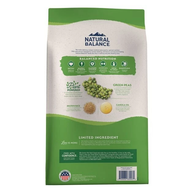 Give your precious pooch the nutrients he needs with the wholesome ingredients in Natural Balance Limited Ingredient Vegetarian Recipe Dry Dog Food! An alternative to a meat-based diet, this tasty vegetarian dog chow is made with delicious vegetables and wholesome grains like barley and peas. With no meat, dairy, soy, gluten, artificial colors, or artificial flavors, this hearty dog chow is the paw-fect meal for all kinds of pupsโincluding those with sensitive stomachs, skin irritations, and allergies. It contains the essential nutrients your dog needs without meat, meaning it is ideal for meat-free households. Simply serve at mealtimes and watch as your pal goes crazy for the delightful crunch!